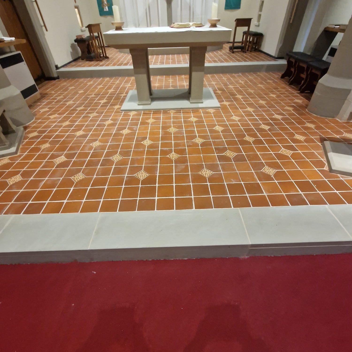 To elevate the altar area with a timeless, durable finish, we installed a new set of natural stone steps. The stone was chosen to complement the church’s existing interior palette while enhancing visual prominence and accessibility of the sanctuary.